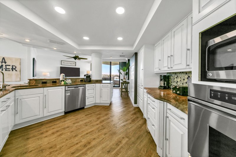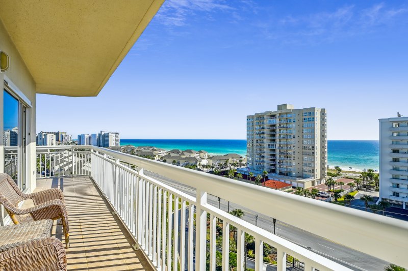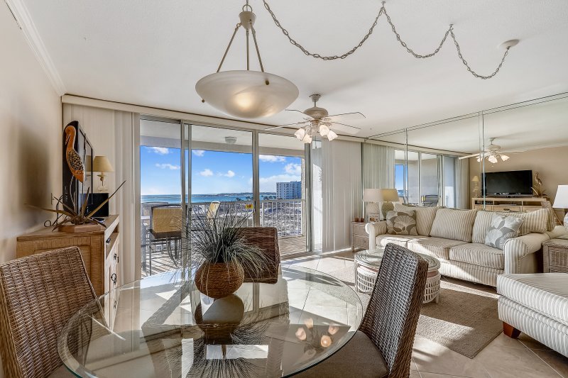Spectacular views of the Destin Harbor and Crab Island at its finest. This exquisite Martinique floor plan is 2100 sq ft with three large bedrooms, two full baths and 1 half bath, with two expansive balconies. This gorgeous, top floor immaculately maintained condo boasts an open floor plan perfect for entertaining. Features include floor to ceiling windows with gorgeous harbor views from the two living areas, dining, and all bedrooms. Queen gel sleeper sofa in Living Room! Enjoy entertaining family and friends in this open gourmet chef's kitchen with granite countertops, custom cabinetry, decorative backsplash, wainscoting, large wrap around breakfast bar, stainless steel appliances, two wine coolers and much more! Beach chairs and umbrella available for guest use stored in garage closet.