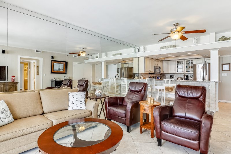 This beautiful condo is beachfront with great views. It has recently been updated with fresh paint and new furniture. Our condo features a large, inviting living and dining area that overlooks the Gulf with stunning views! There is plenty of room here for family and friends to gather for a nice meal or some serious game or movie watching on the flat-screen TV.