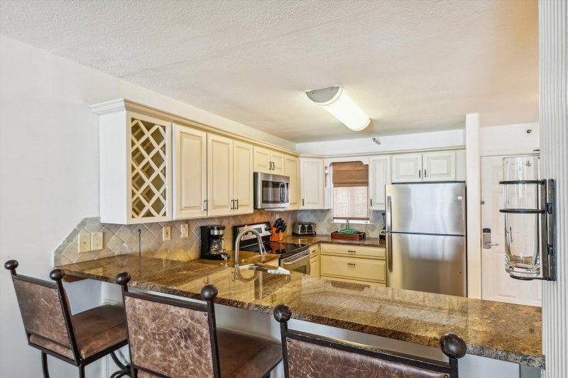 Unit 321 is a 3 bedroom 2 bathroom condo that sleeps 8. King bed in the master with private bathroom and a queen bed in the guest bedroom with a hall bathroom and a third bedroom as well. Sleeper sofa in the living area. The kitchen is fully stocked with normal amenities like pots/pans, blender, toaster, and a coffeemaker.