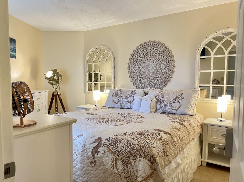 The 1200 sq. ft. unit is tiled throughout. The master bedroom (king) has its own full bath with a brand new tiled shower, the other 2 bedrooms (queens) share a full bath with a shower/tub combo. There is a half bath in the hallway as well as washer/dryer for your convenience.