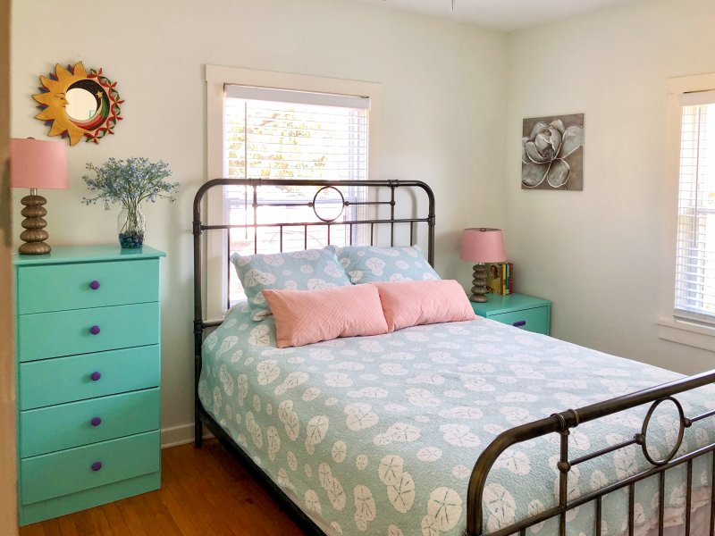 Newly installed mattress toppers add comfort to both beds. The shared bath - which is quite spacious for a 1920s home!—has been updated with new tile floors.