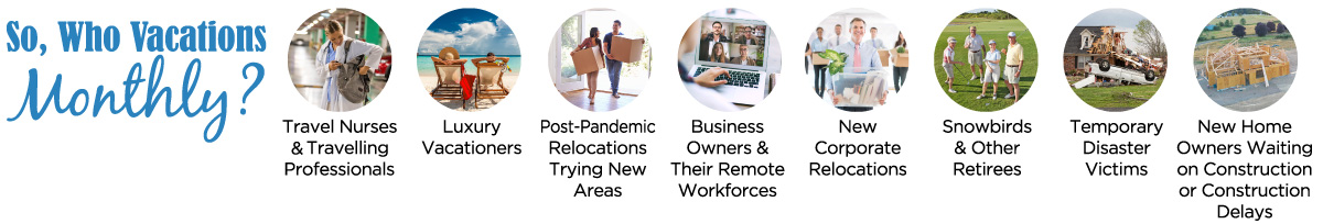 These Monthly renters – actually, mostly MULTI-Month Vacationers are often open to paying larger fees for shoulder months, as they realize supply-and-demand vs. what you may otherwise make in nightly/weekly stays. This opens an entire new profitability trend for Vacation Rental Managers (VRMs) and Property Owners to both fill the units and get often more-reliable, less wear-and-tear guests who many times return year-after-year to the same properties for the same months!